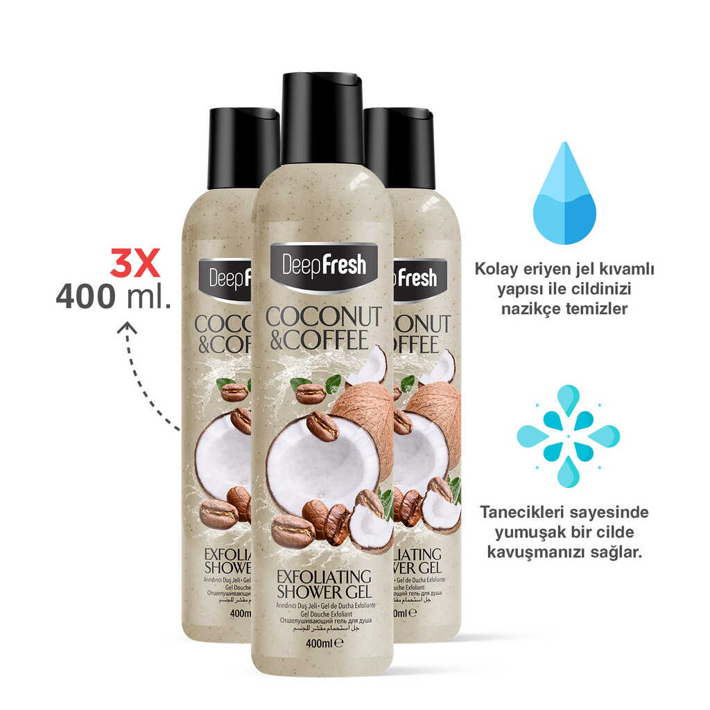 Deep Fresh Arındırıcı Peeling Duş Jeli Hindistan Cevizi & Kahve 400 ml 3 Adet | Body Scrub | Pürüzsüz Cilt
