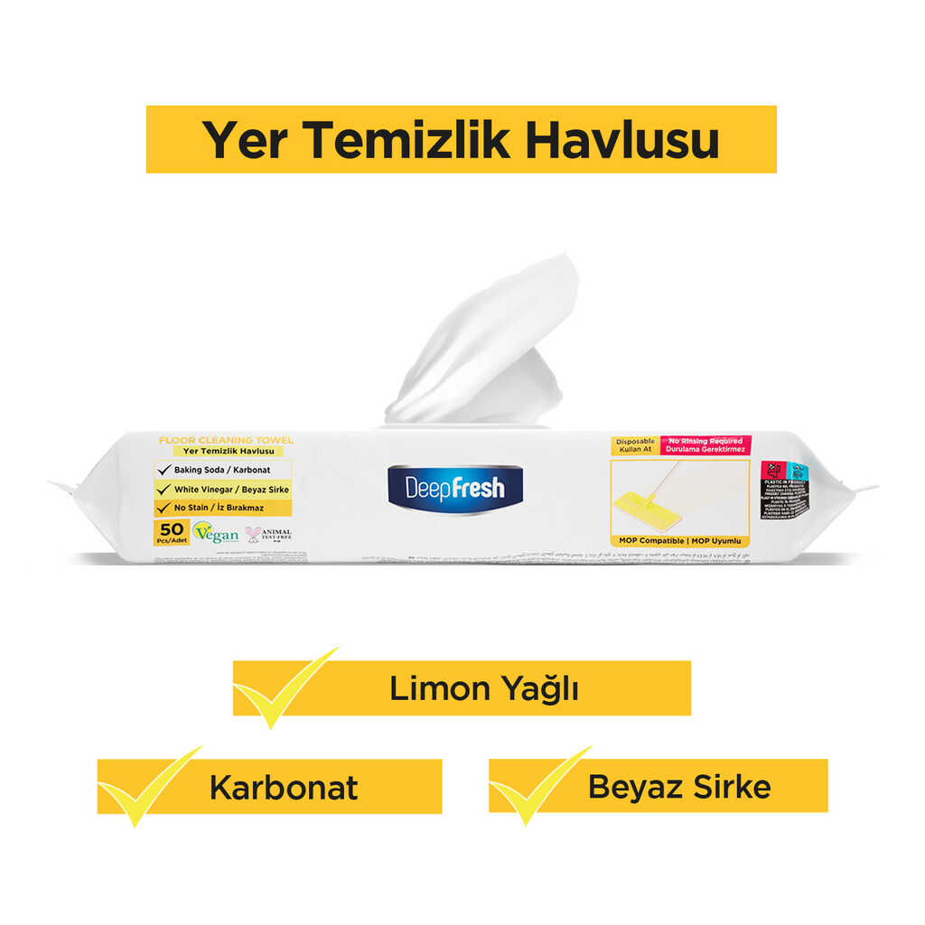 Deep Fresh İz Bırakmaz Mop Uyumlu Yer Temizleme Havlusu 50 Yaprak 3 Adet | Limon Yağlı | Karbonat, Beyaz Sirke