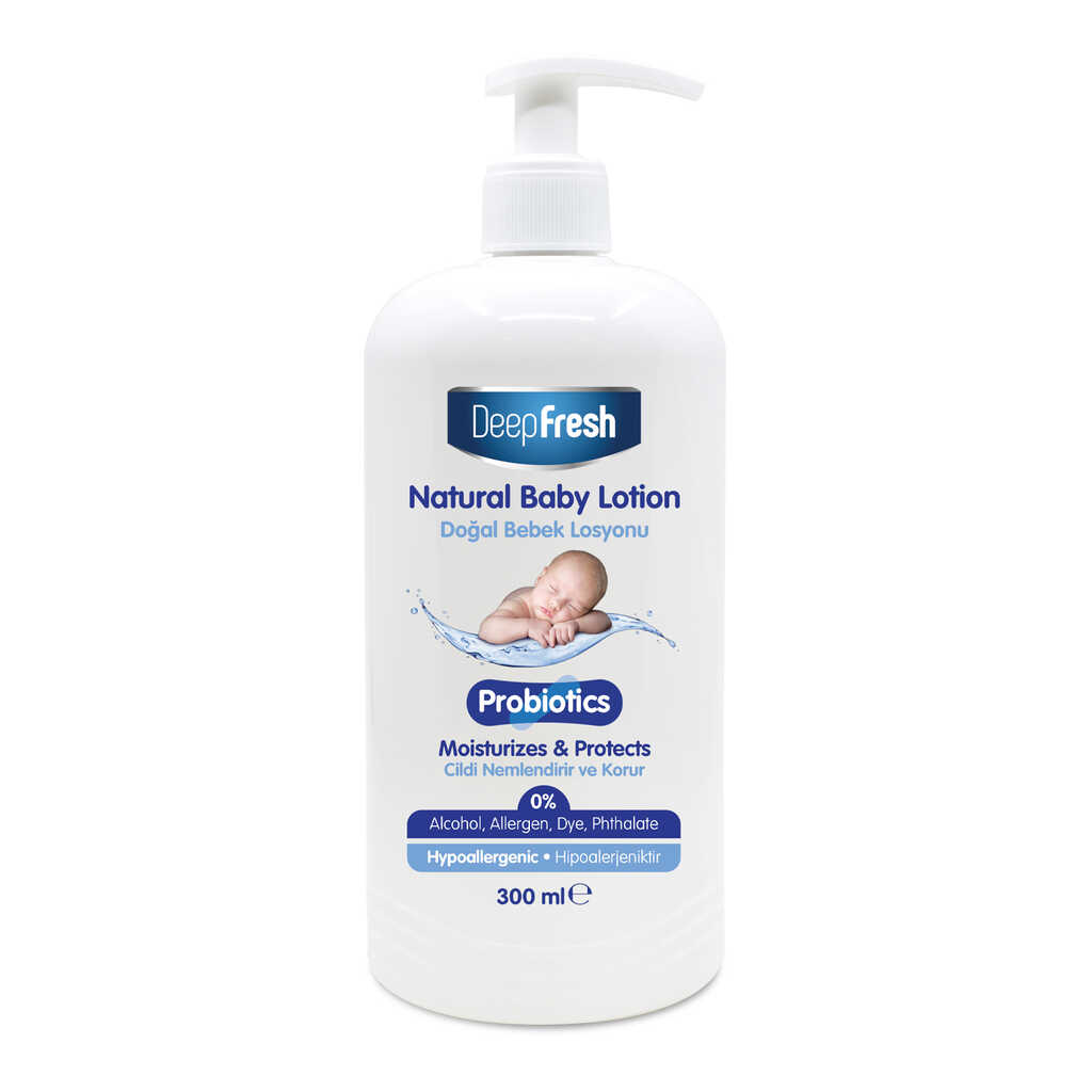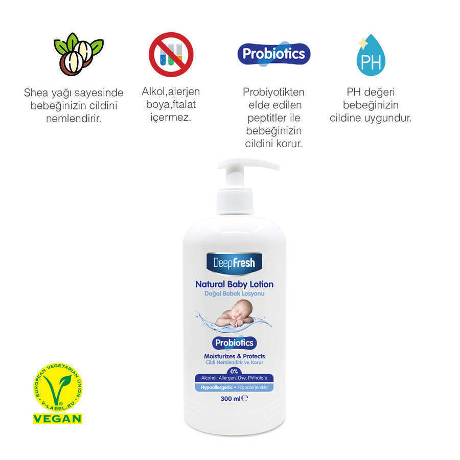 Probiyotiklerin Cilde Faydaları Mikrobiyom dengesini düzenleyip, güçIendirerek cilt hassasiyetini yatıştırmaya yardımcı olur. Probiyotikler cildin bariyer fonksiyonunu destekler. Lipid bariyerini güçlendirerek cildin kurumaya karşı daha dirençli hale gelmesinde rol oynar. Probiyotikler dışardan gelen yabancı mikropları kolayca saptar ve potansiyel tehditlere karşı koruyucu duvar oluşturur. Probiyotikler bebek cildinin dogal florasina zarar vermez. Verniks katmanı bebegin vücut ısısını dengede tutarak, dış etkenlere karşı koruyan bir bariyerdir ve verniksin kimyasallardan korunmasını amaçIayan probiyotikler sayesinde doğal koruma ve bakım sağlanır. Probiyotikten elde edilen peptidler doğal nemlendirme, doğal bakım ve doğal antimikrobiyal etki sağlar. DeepFresh Probiotics Doğal Bebek Losyonu, probiyotiklerden elde edilen peptidler içeren formülü sayesinde bebeğinizin hassas cilt bariyerini korumaya yardımcı olur. İçerdiği Shea yağı bebeğinizin hassas cildinin ihtiyacı olan nemi sağlar. Kolay sürülen ve hızlı emilen yapısı ile bebeğinizin cildine kolayca uygulanır. Alkol, alerjen, boya, ftalat içermez. Hipoalerjeniktir. pH değeri bebeğinizin hassas cildi için uygundur. İlk günden itibaren yeni doğmuş bebekler için kullanıma uygundur. Formülasyonunda hayvansal kökenli hammaddeler kullanılmamıştır. Vegan sertifikasına sahiptir. Ürün Bileşenleri: Aqua, Isopropyl Myristate, Glycerin, Ethylhexyl Palmitate, Glycerin Stearate, PEG-100 Stearate, Caprylic/Capric Triglyceride, Sorbitan Caprylate, Butyrospermum Parkii Butter, Hydroxyethyl Acrylate/Sodium Acryloyldimethyl Taurate Copolymer, Parfum, Xanthan Gum, Propanediol, Benzoic Acid, Lactobacillus Ferment, Sodium Hydroxcide, Lactobacillus Ferment, Sorbitan Isostearate, Polysorbate 60, Cocos Nucifera Fruit Extract.